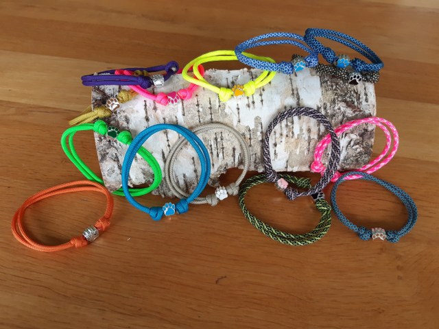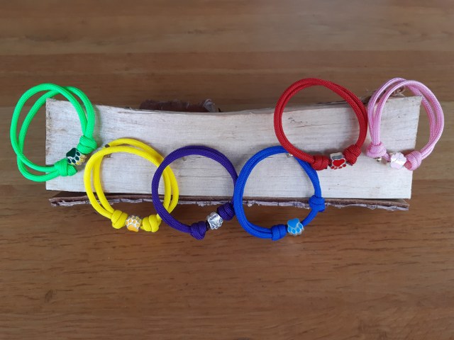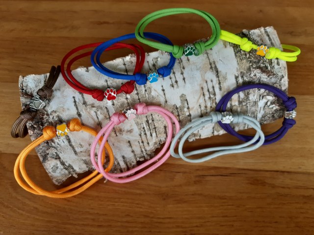 Herkenningsbandjes voor puppy’s gemaakt van paracord, verstelbaar zodat ze kunnen meegroeien met het tempo van de pups en eventueel met een sierkraaltje.